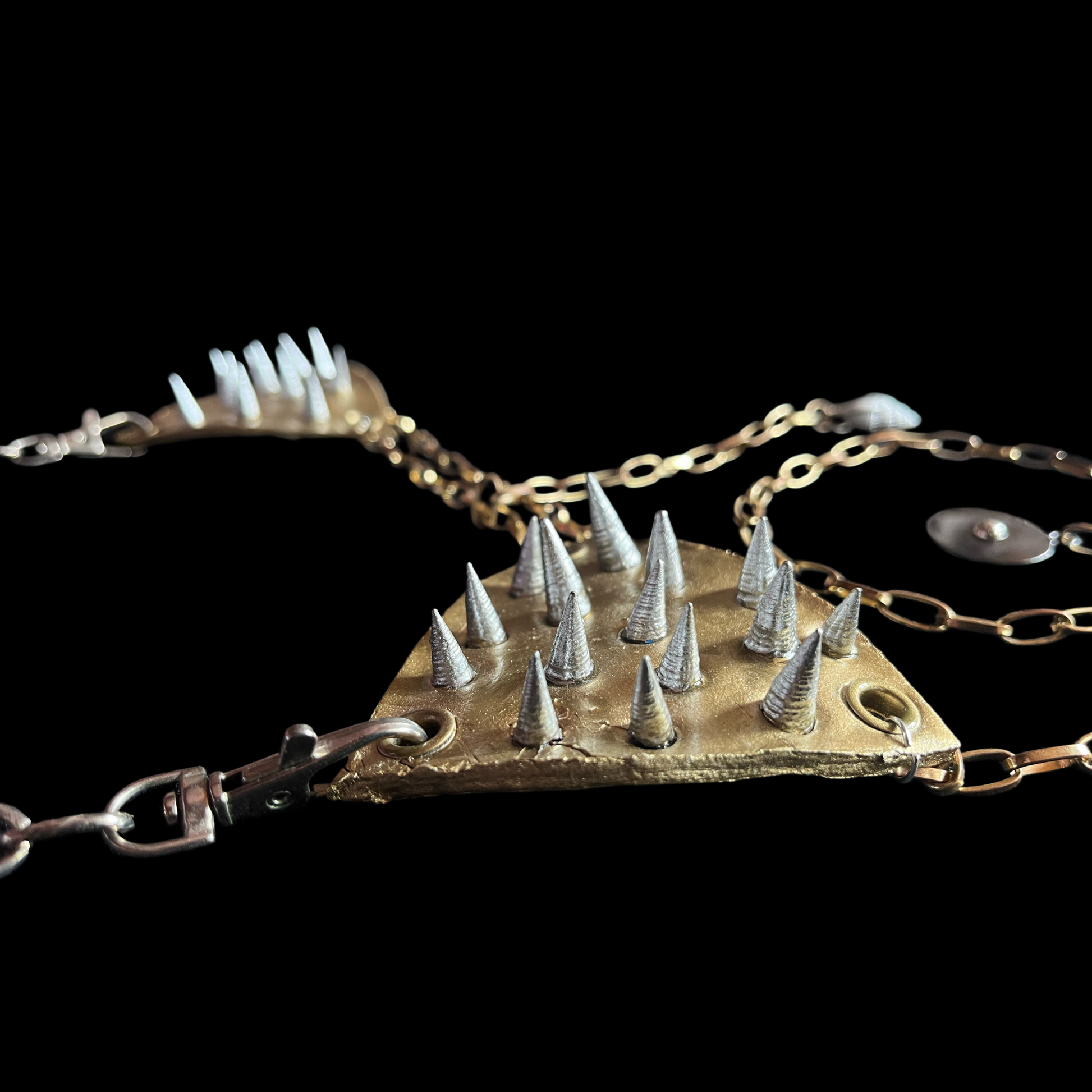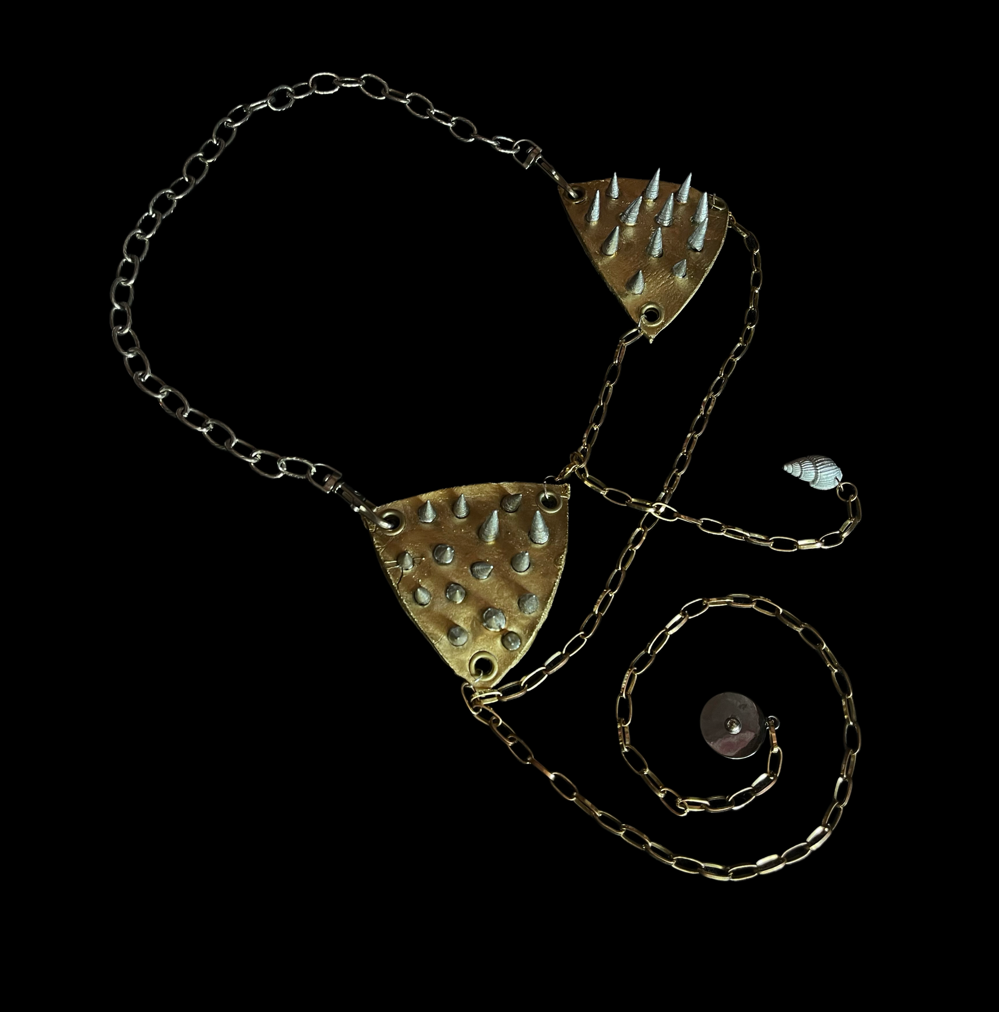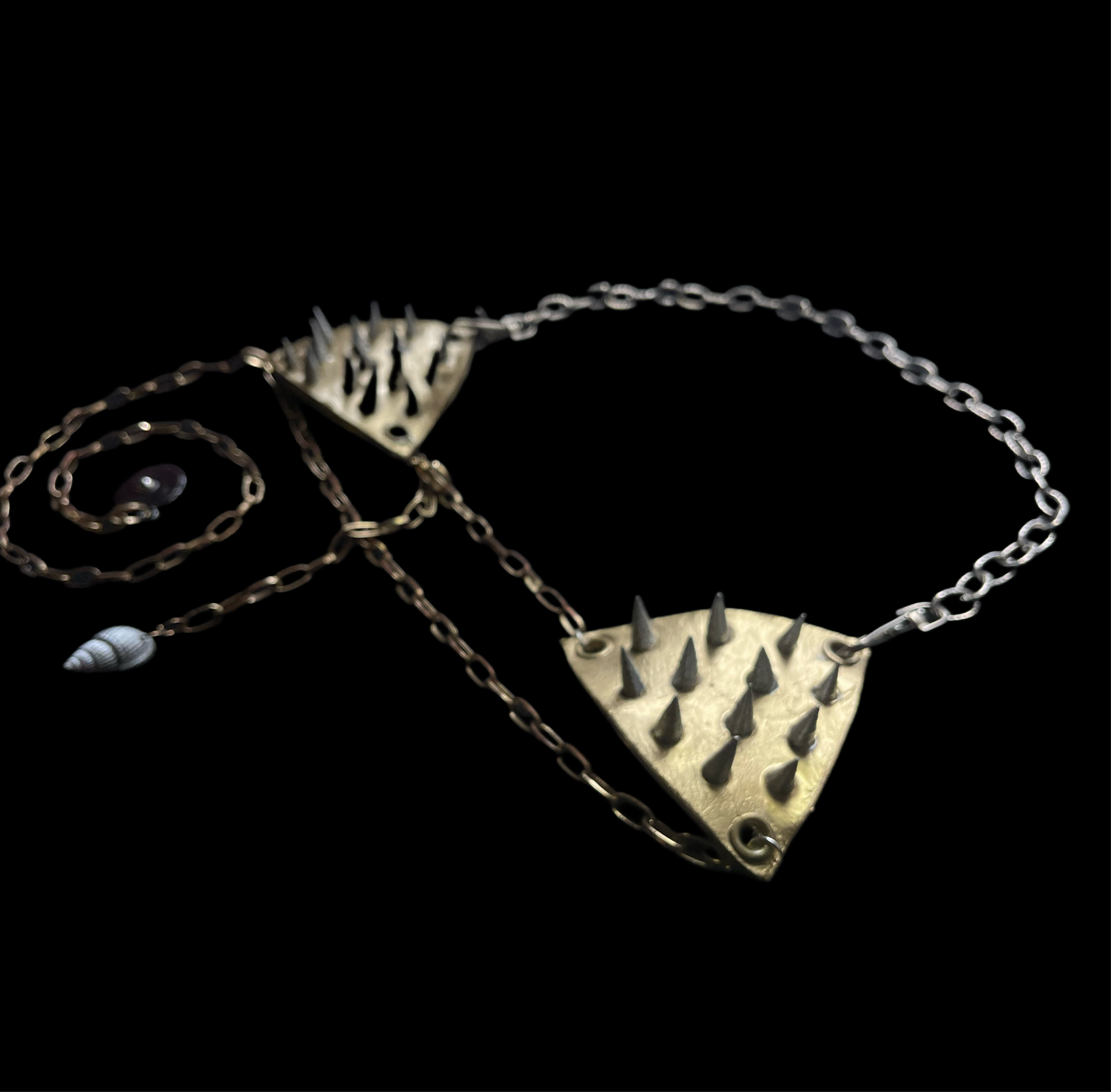 Top de cerámica bañado en resina. Las púas son conchas recolectadas. Cadena ajustable. Medidas: 7cm x 7cm x7cm entrega inmediata, triángulos a medida con entrega en 15 dias.