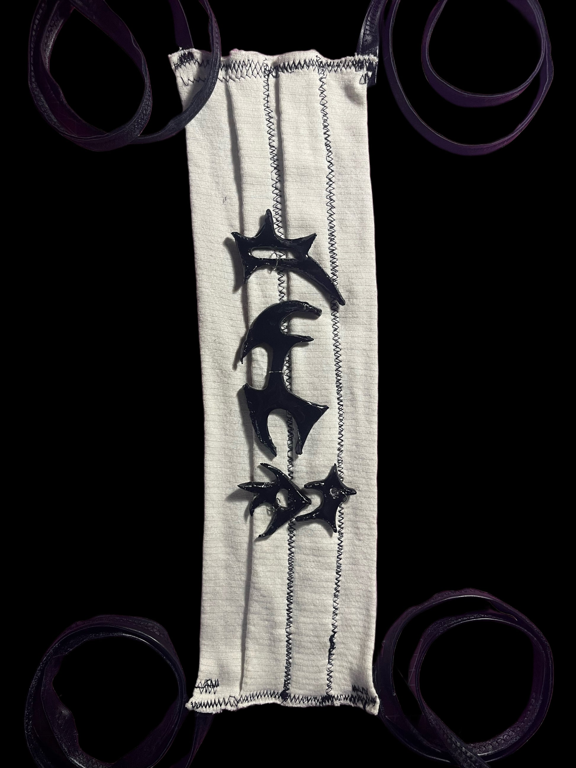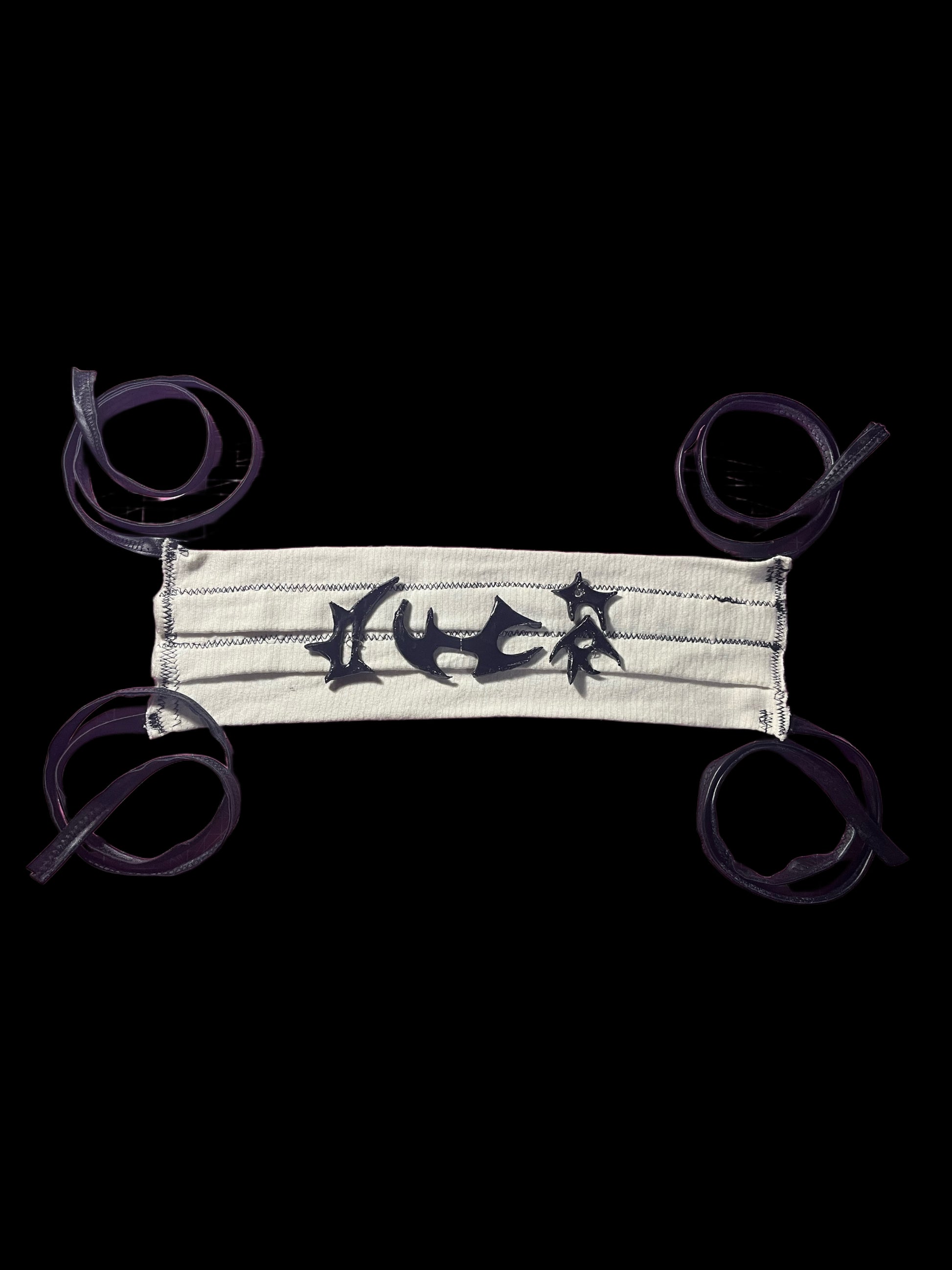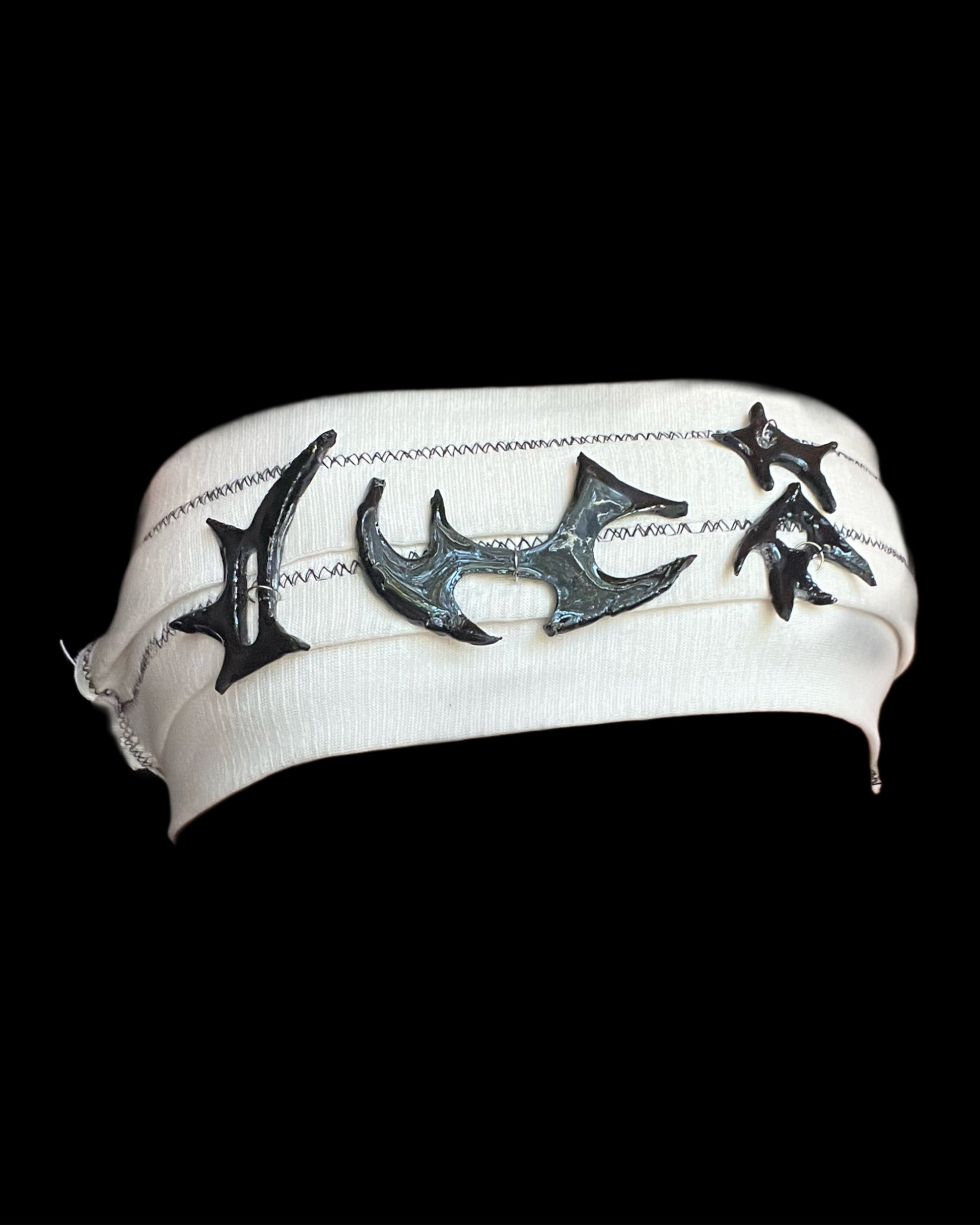 Realizado con vendas, cuerina y piezas de cerámica con resina. Se ajusta a varias tallas.