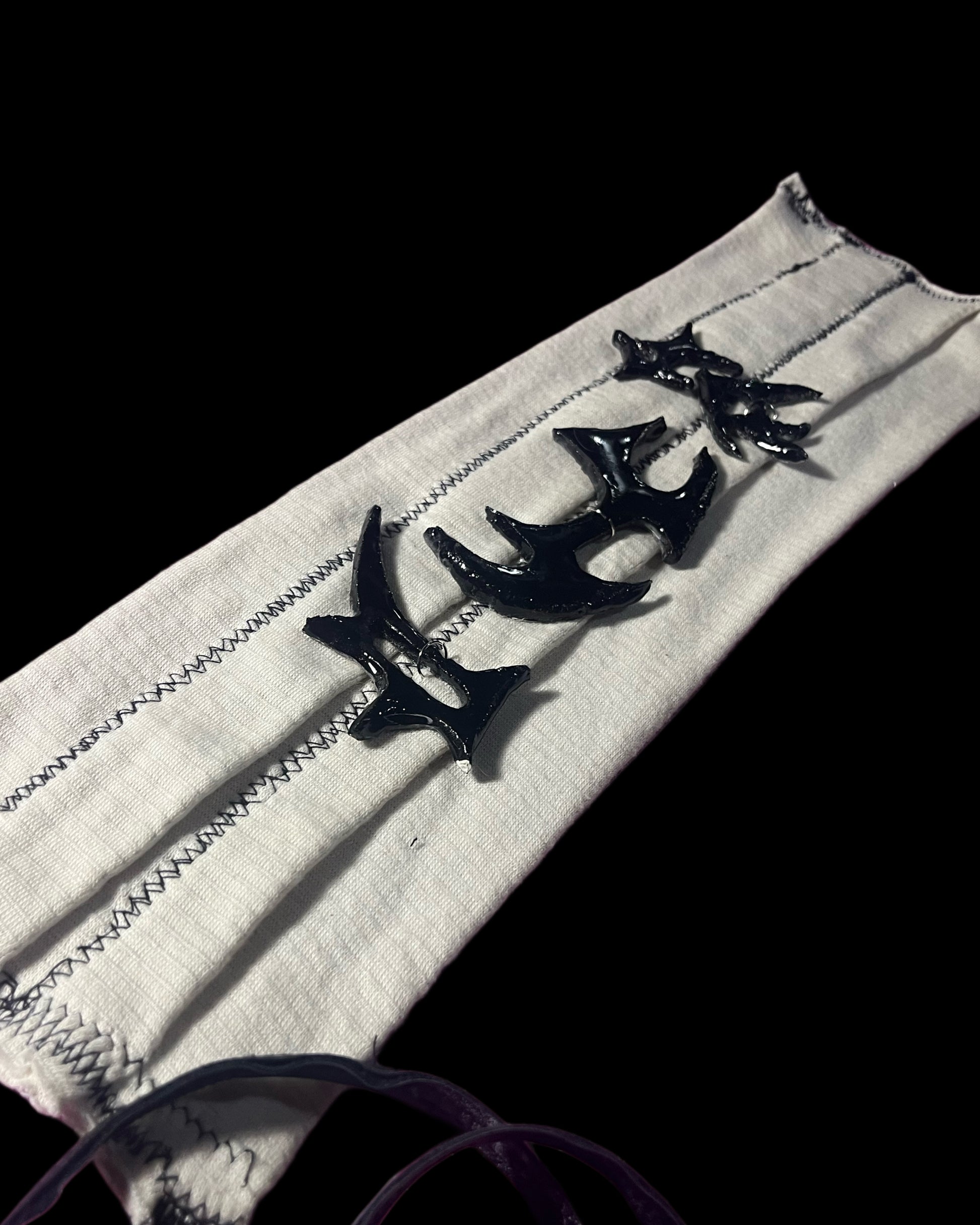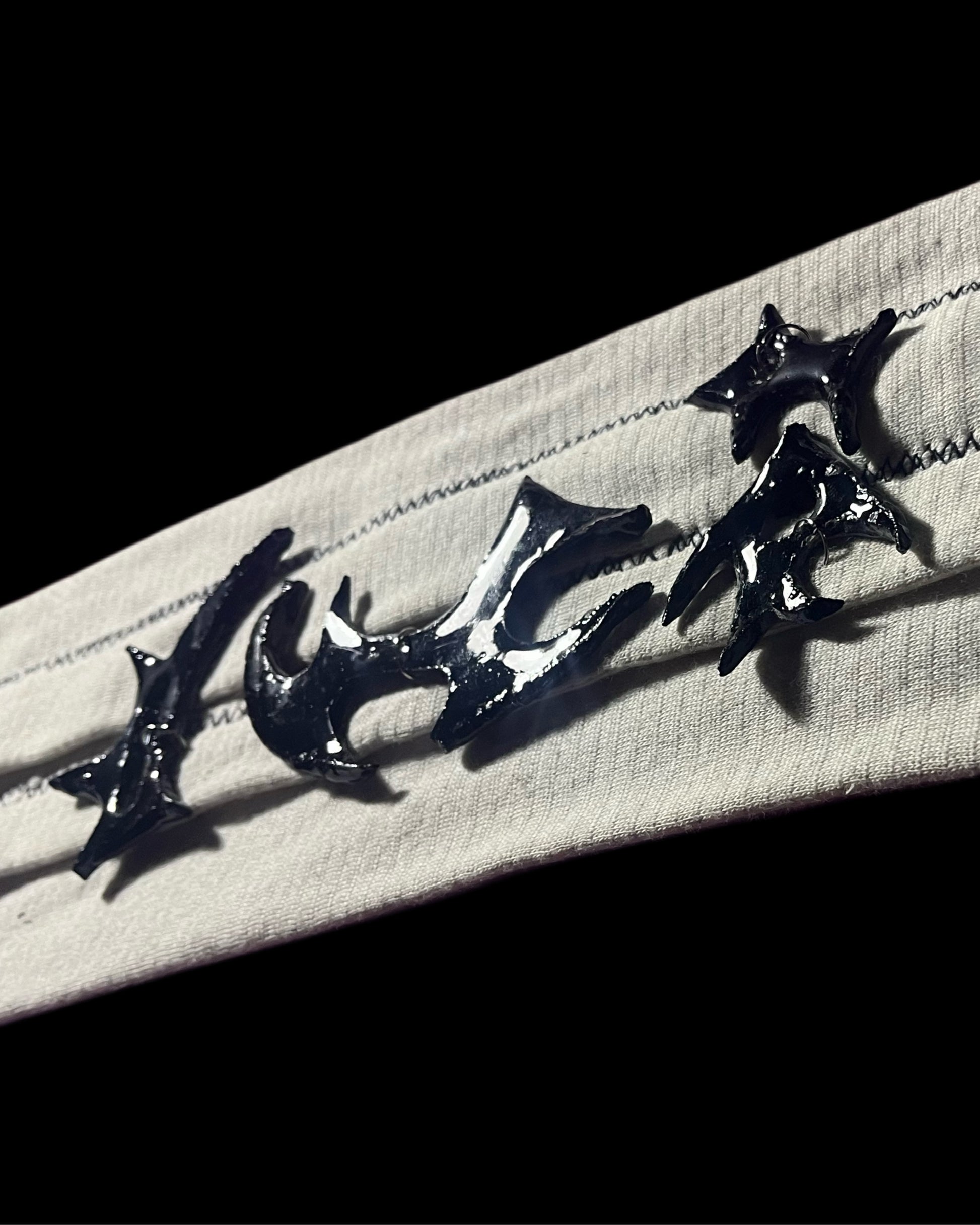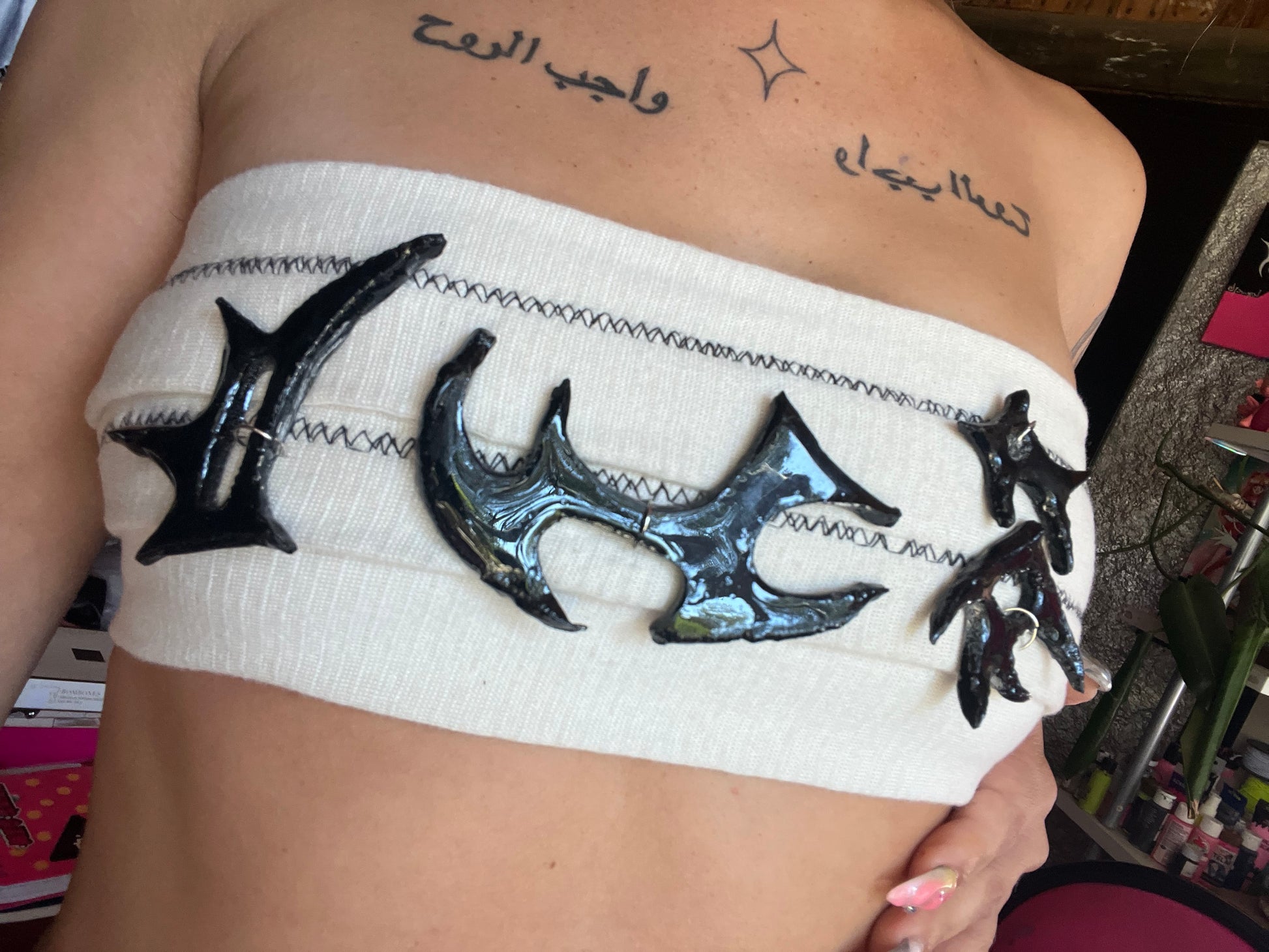Realizado con vendas, cuerina y piezas de cerámica con resina. Se ajusta a varias tallas.