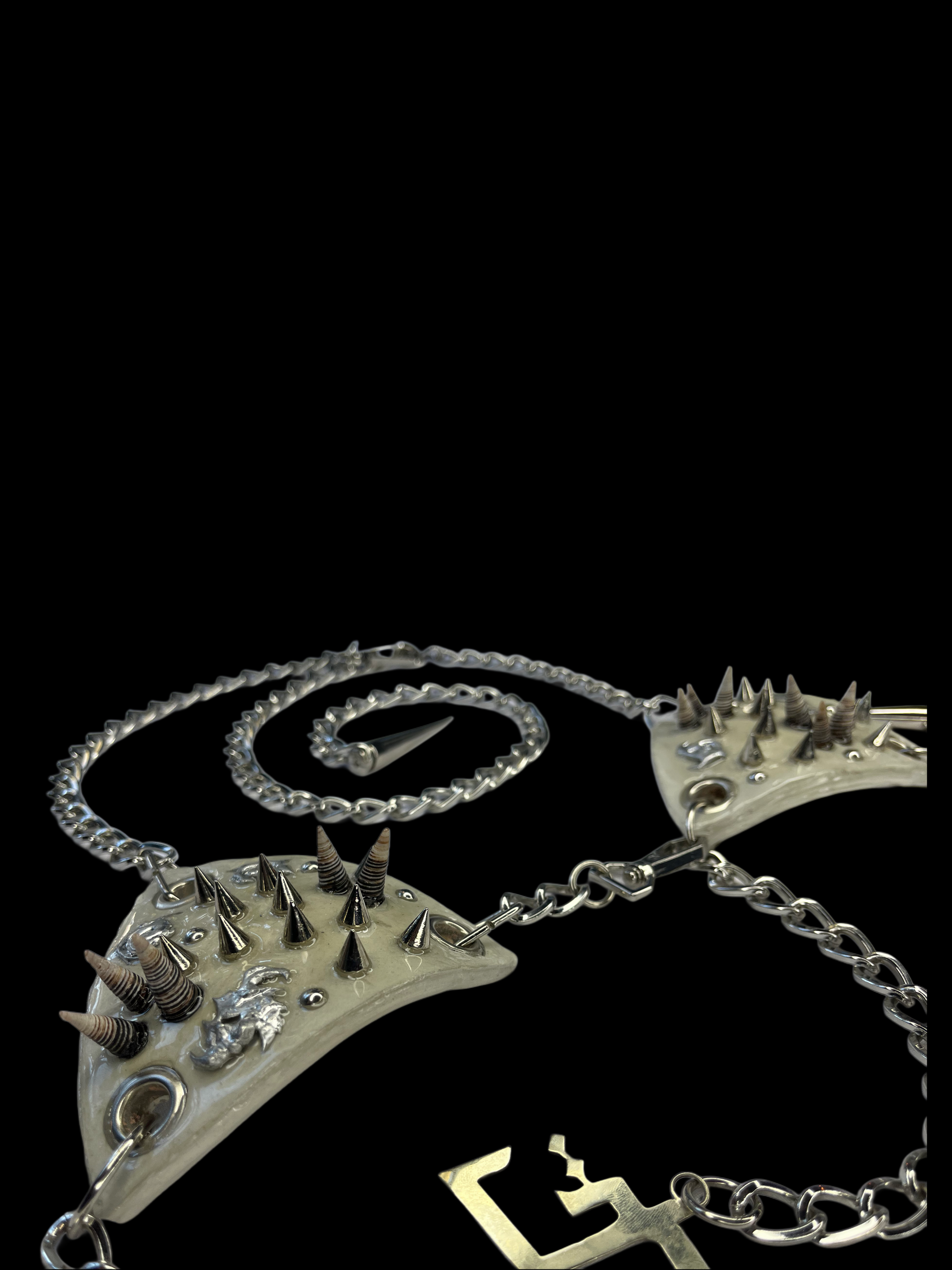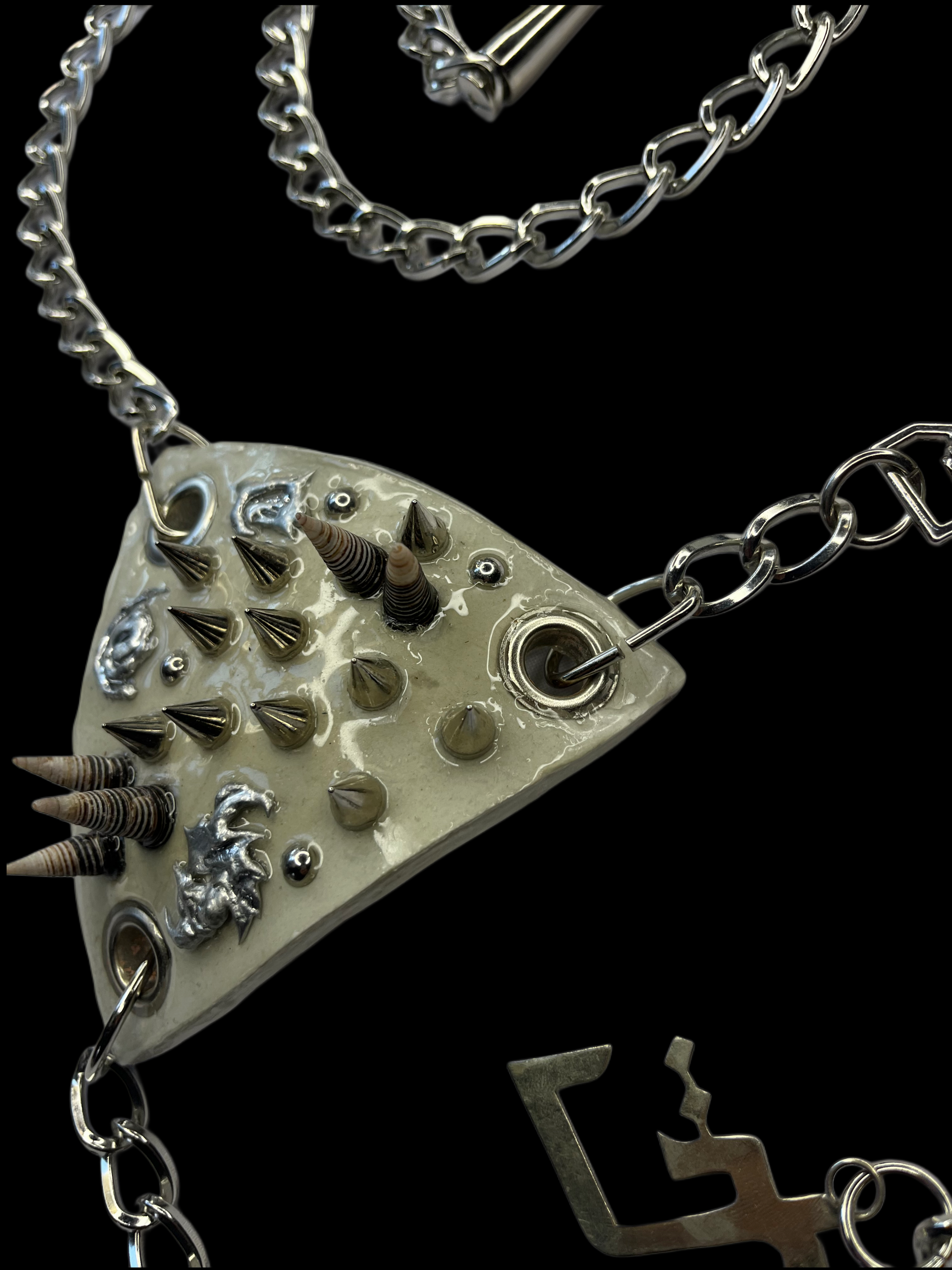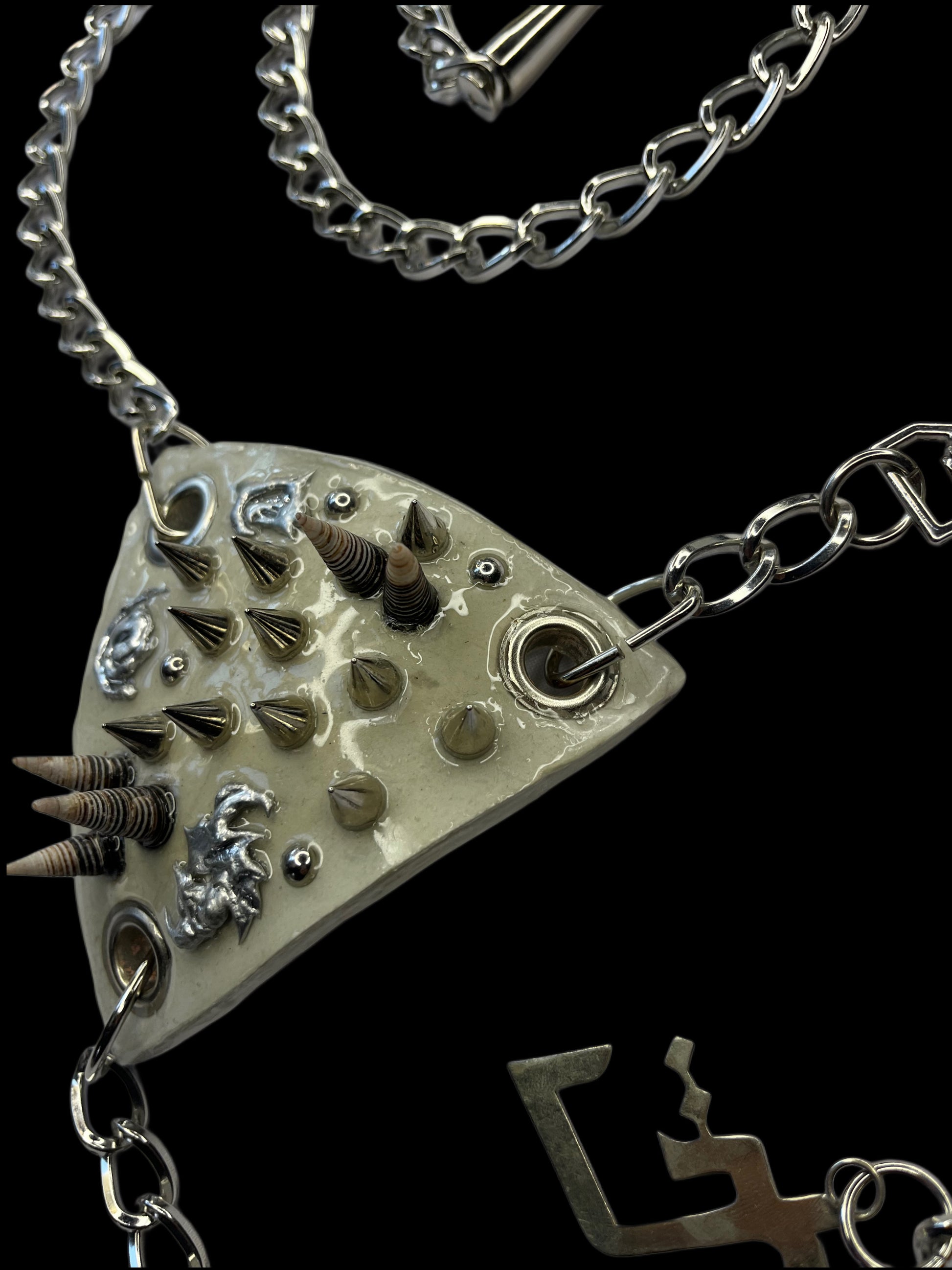 Top de cerámica vitrificado con puas de acero, estaño modelado a mano y conchas recolectadas. Se ajusta en espalda cuello y pecho. Logo F7 de acero.