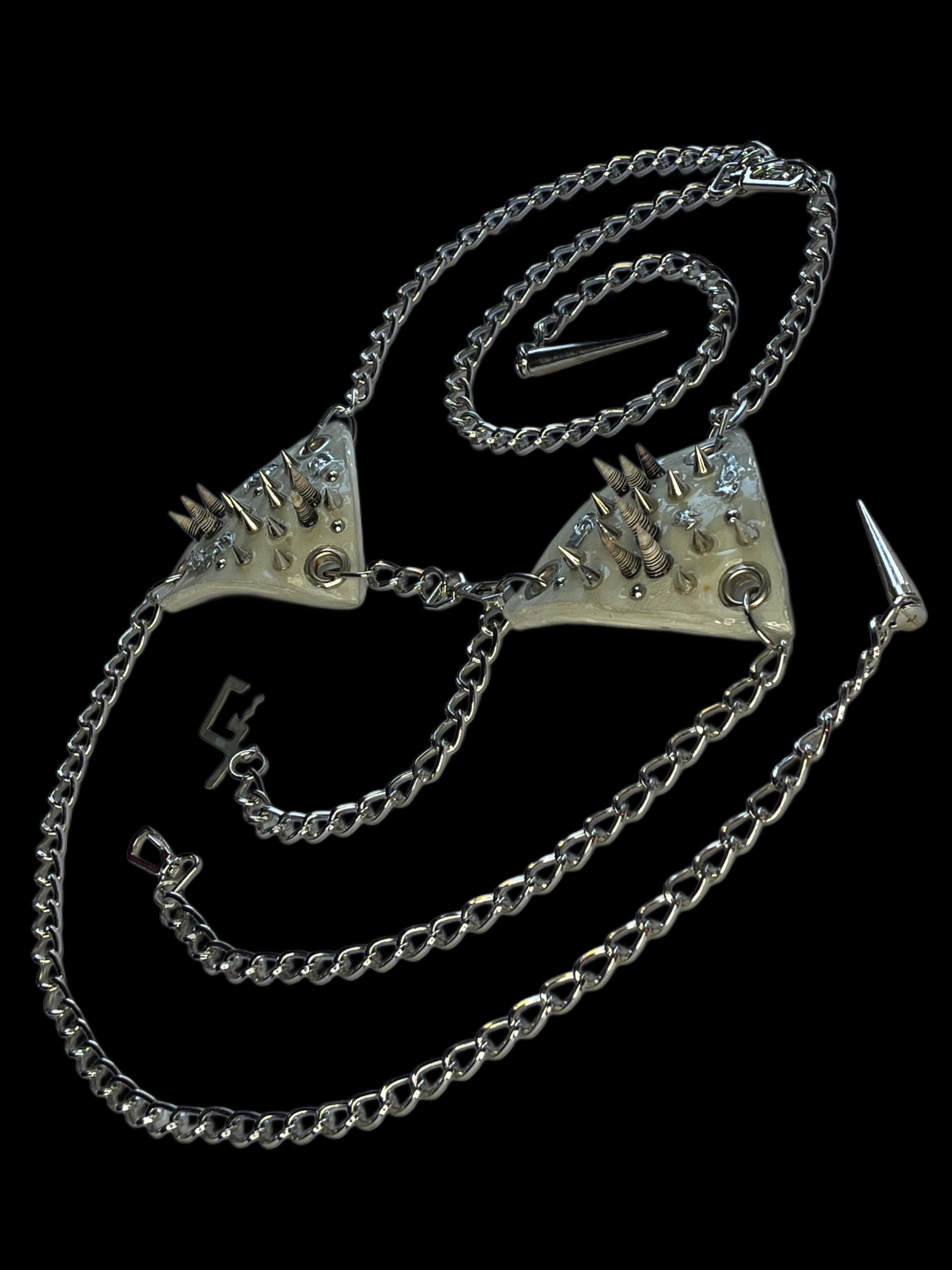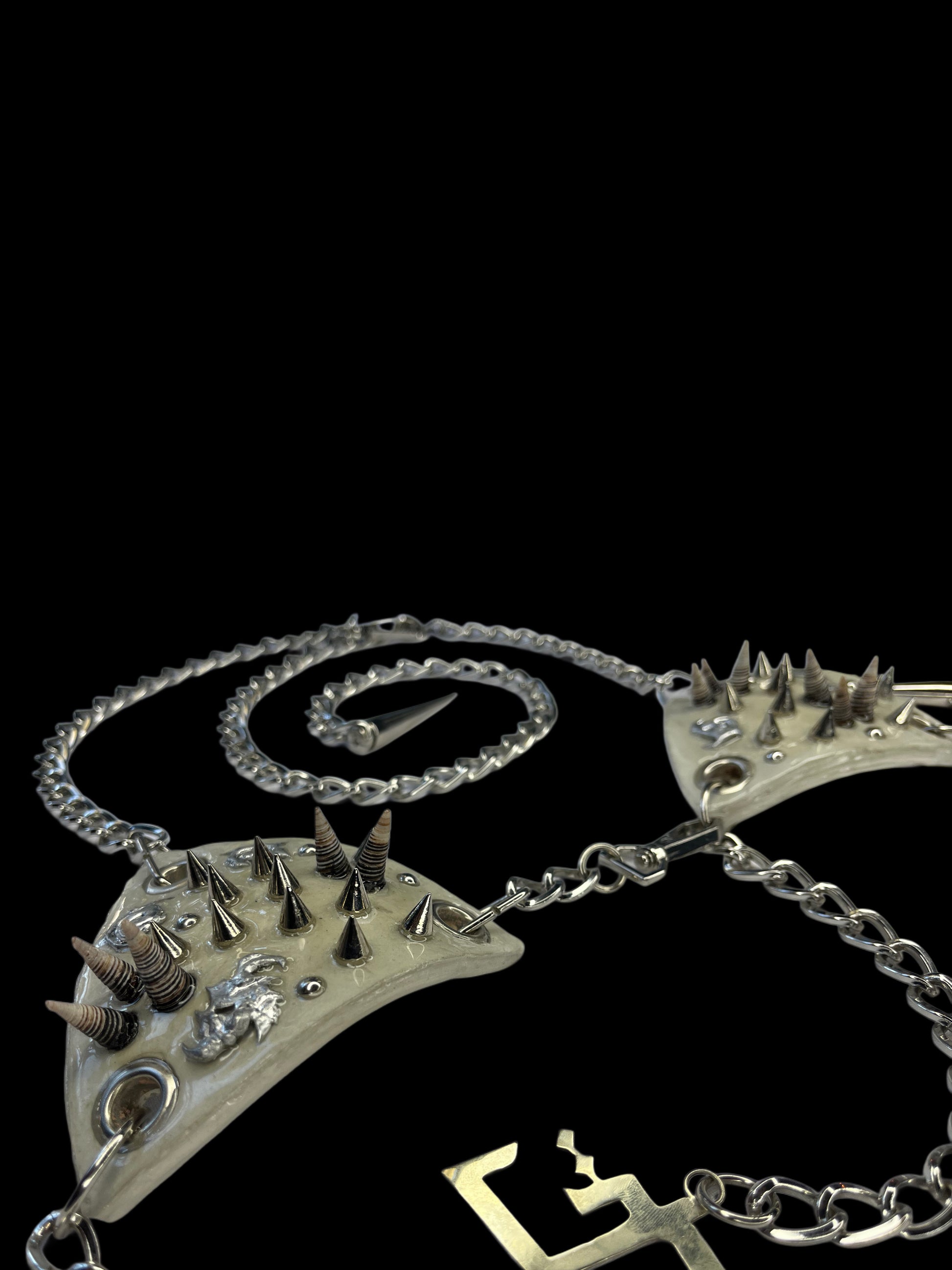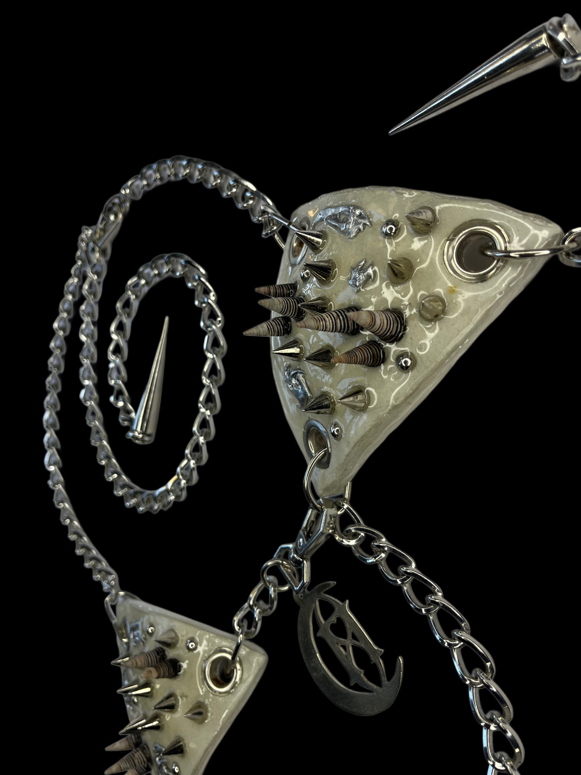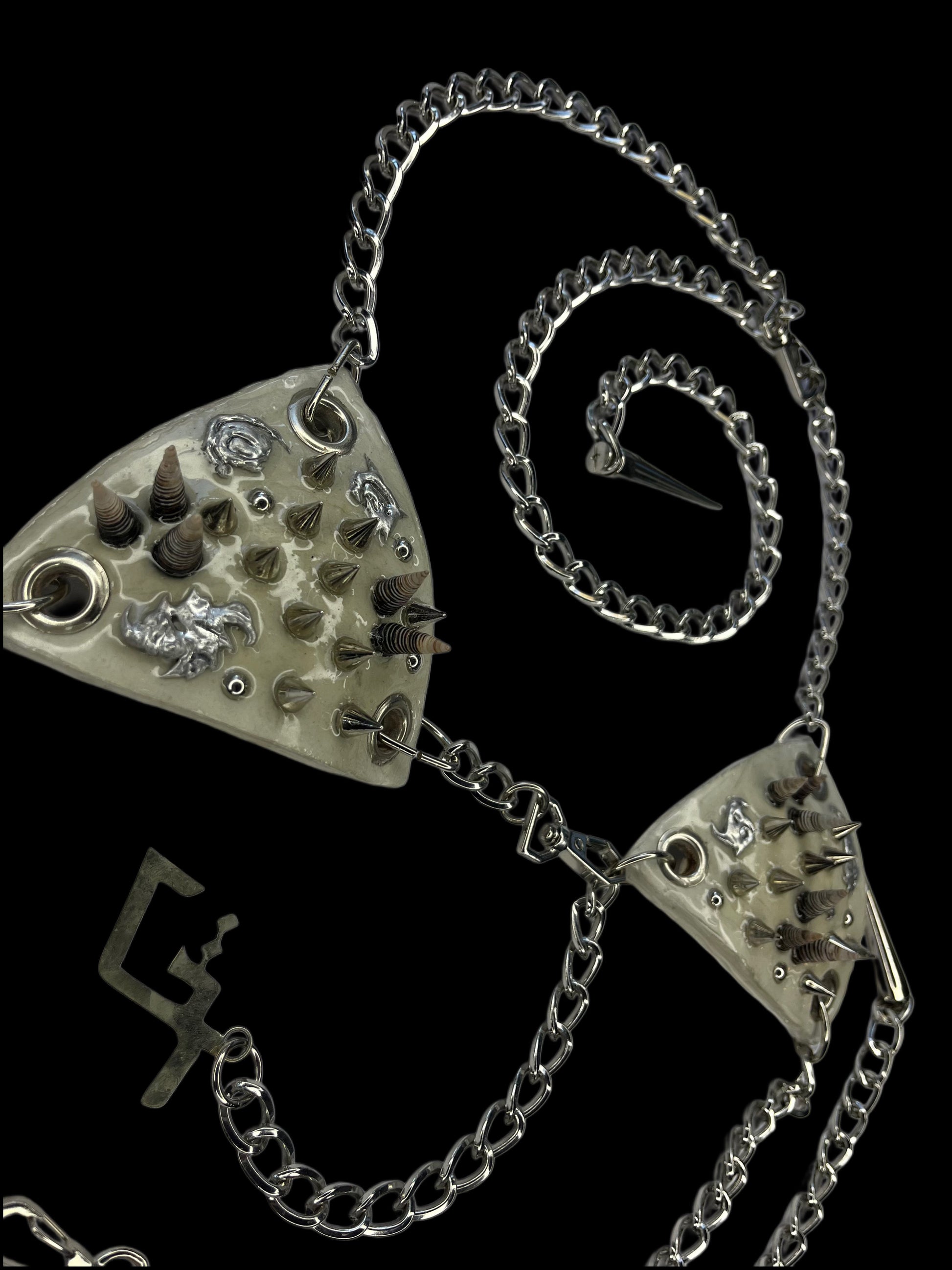 Top de cerámica vitrificado con puas de acero, estaño modelado a mano y conchas recolectadas. Se ajusta en espalda cuello y pecho. Logo F7 de acero.