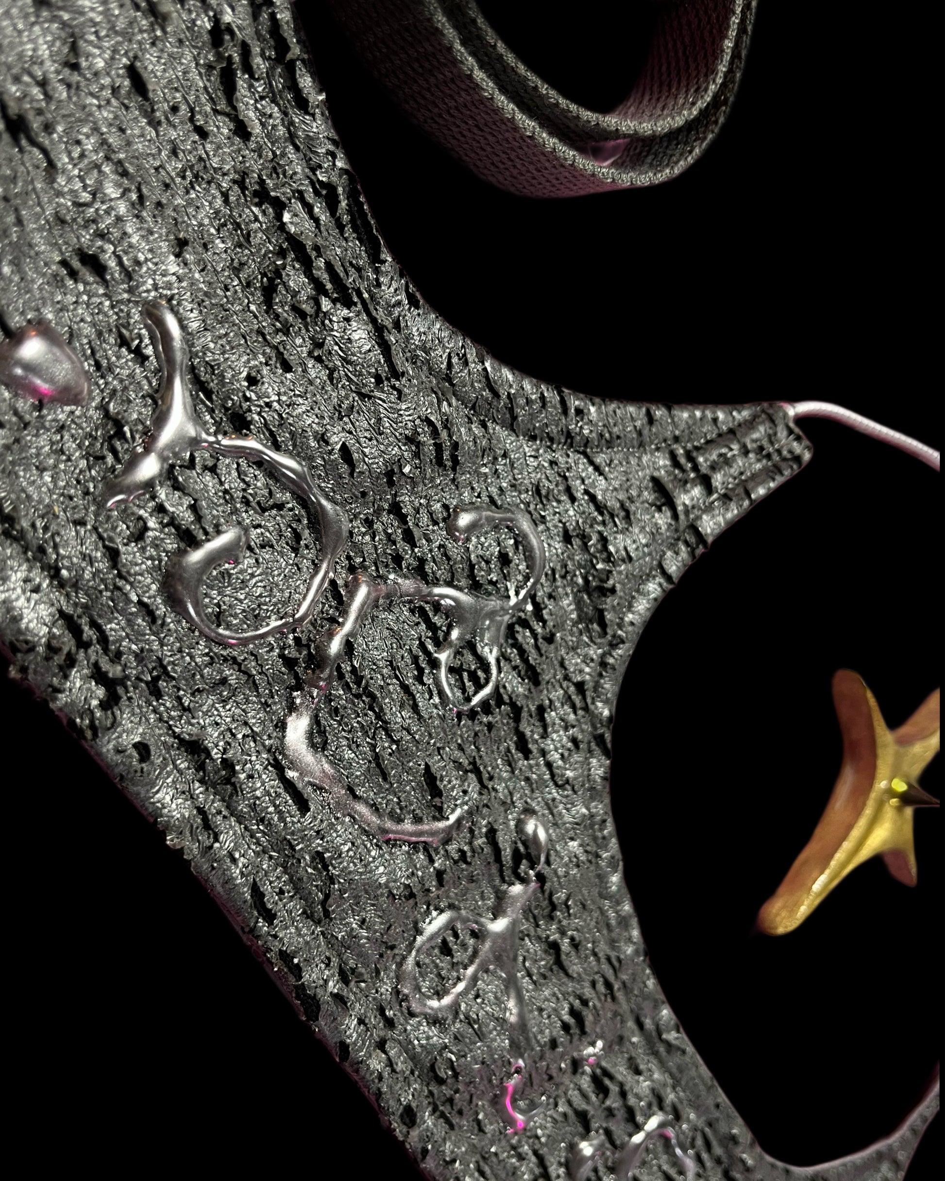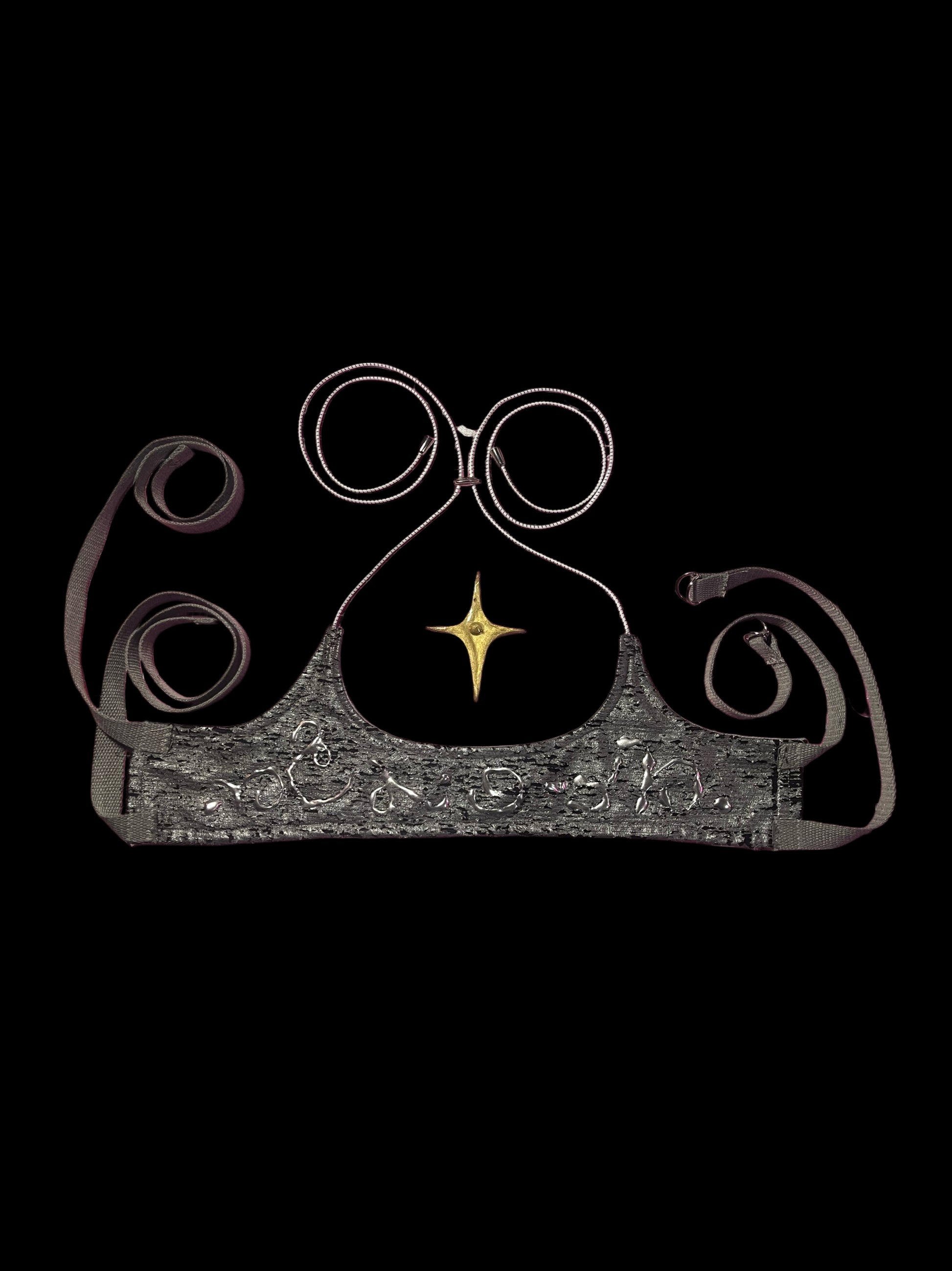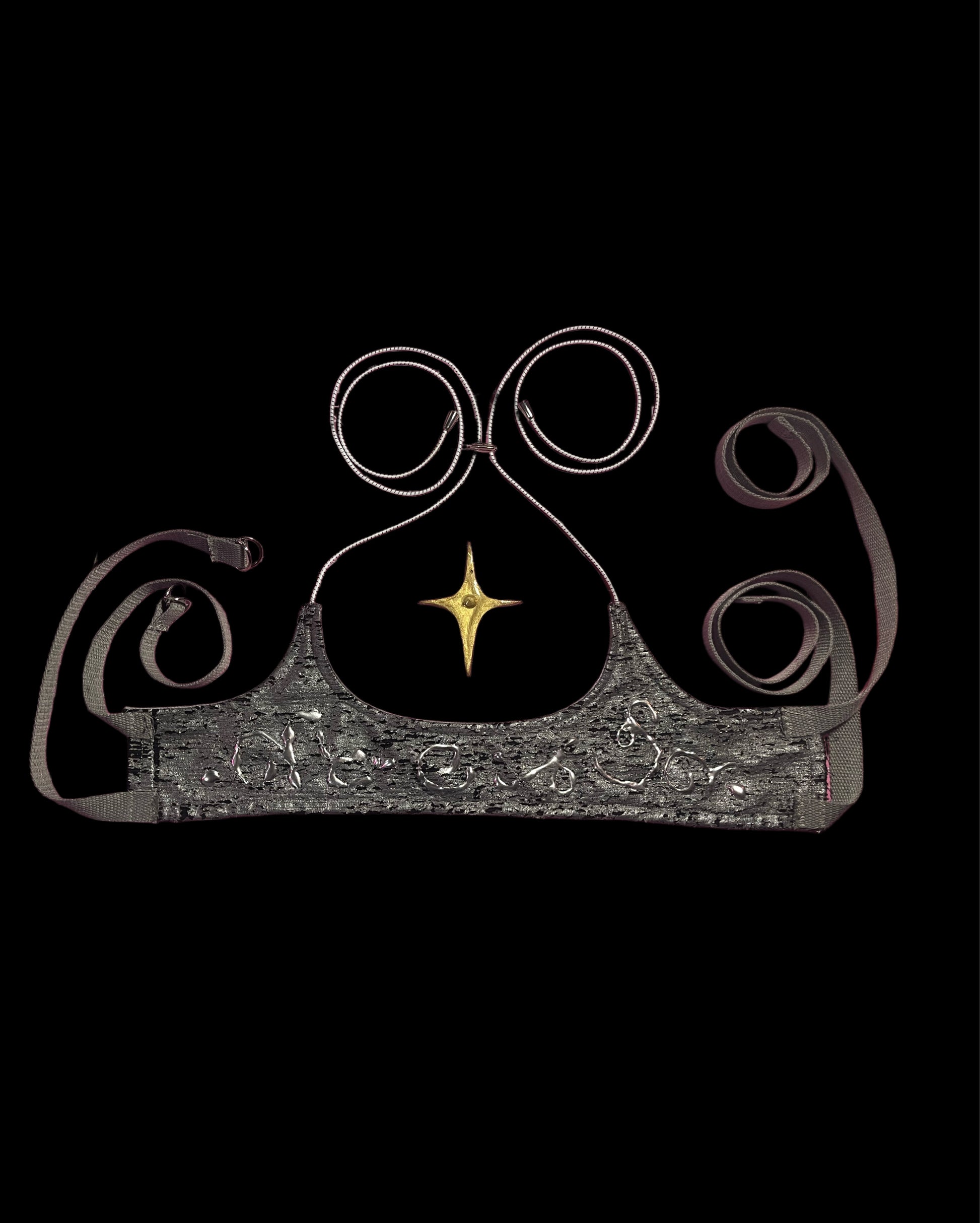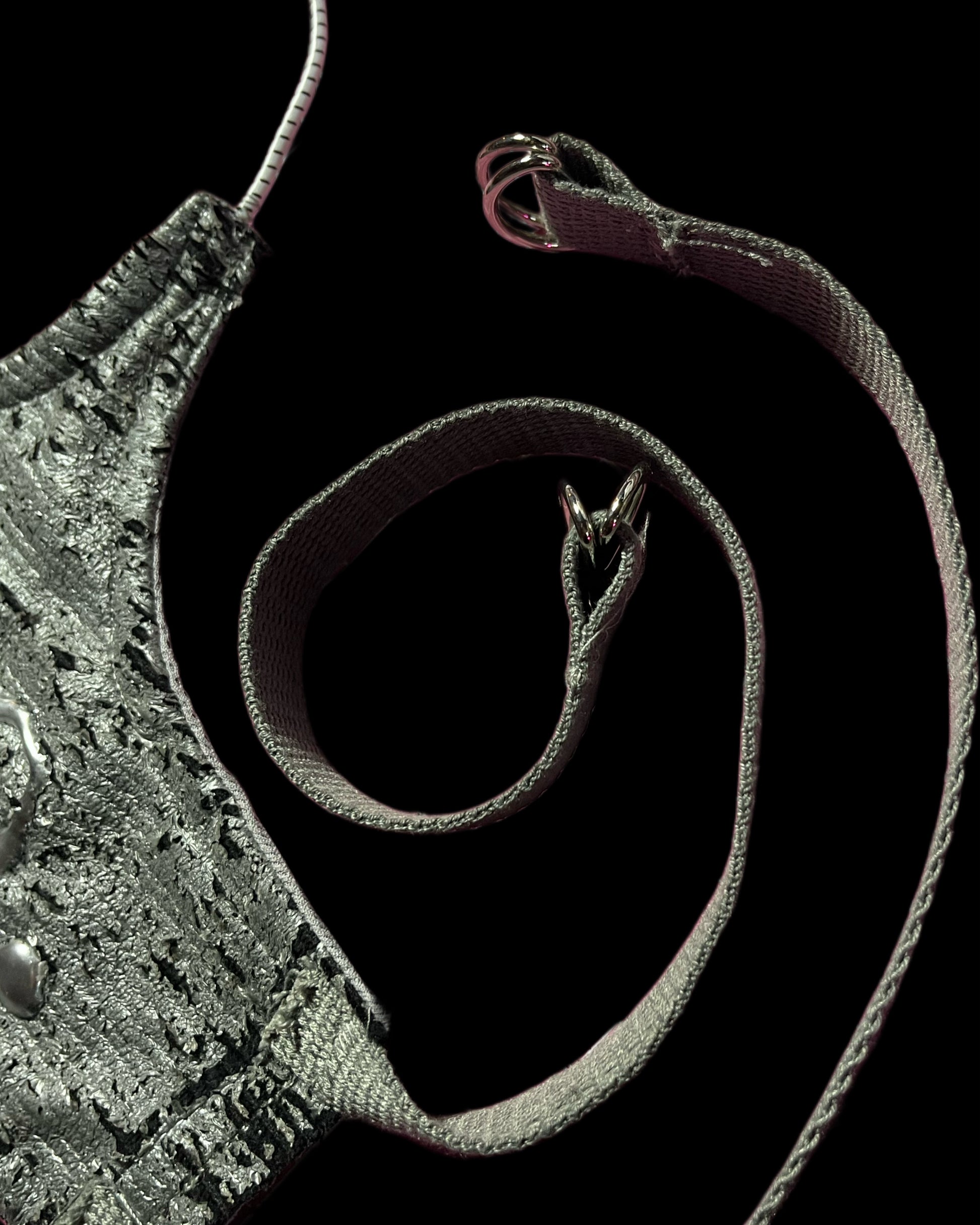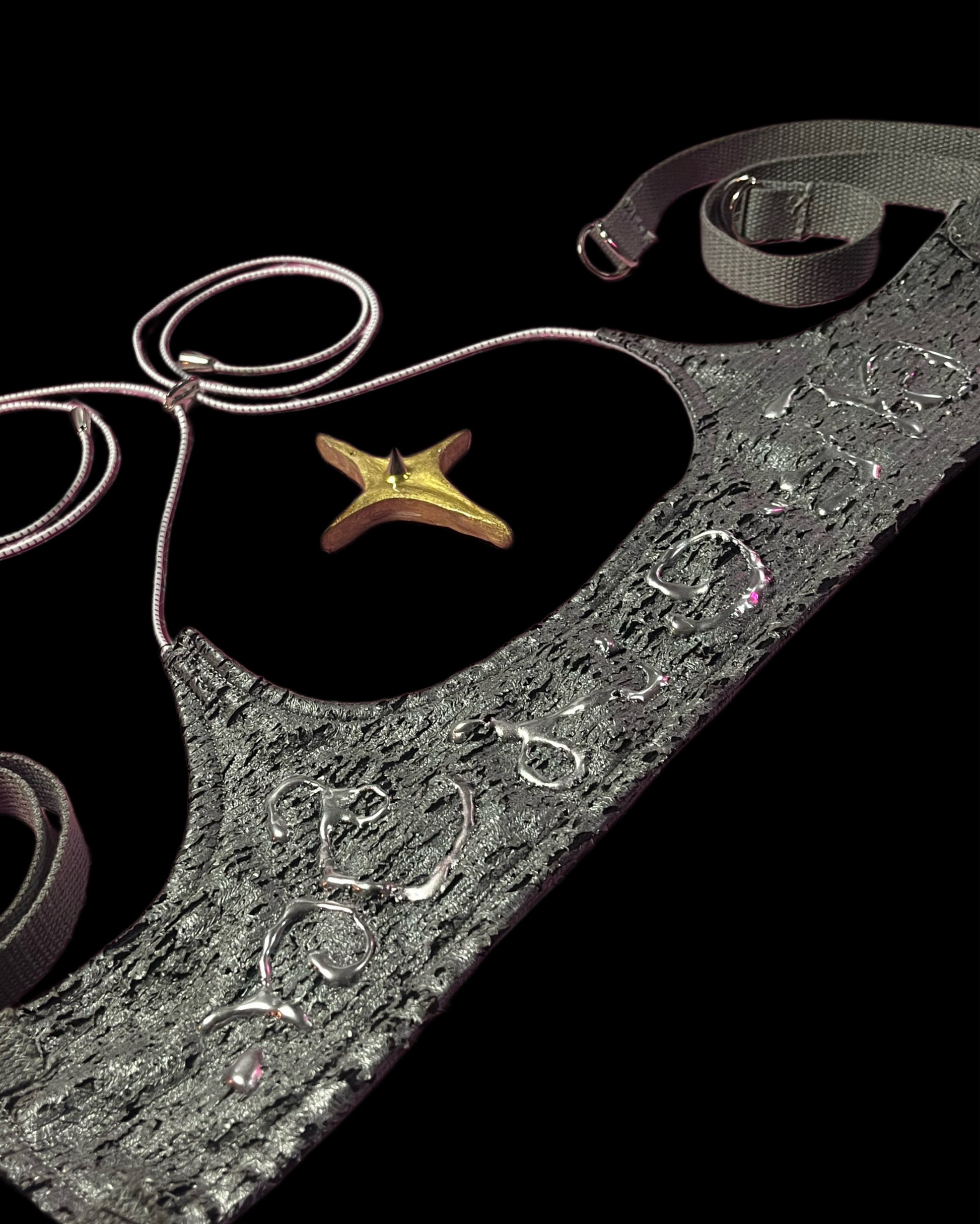 Top de denim con tratamiento metalizado y rasgado. Estampados 3D en resina y pigmento metalizado.Correa de algodon ajustables con hebillas de acero.La correa permite que se adapte a varias tallas S, M y L. Modelo unico.